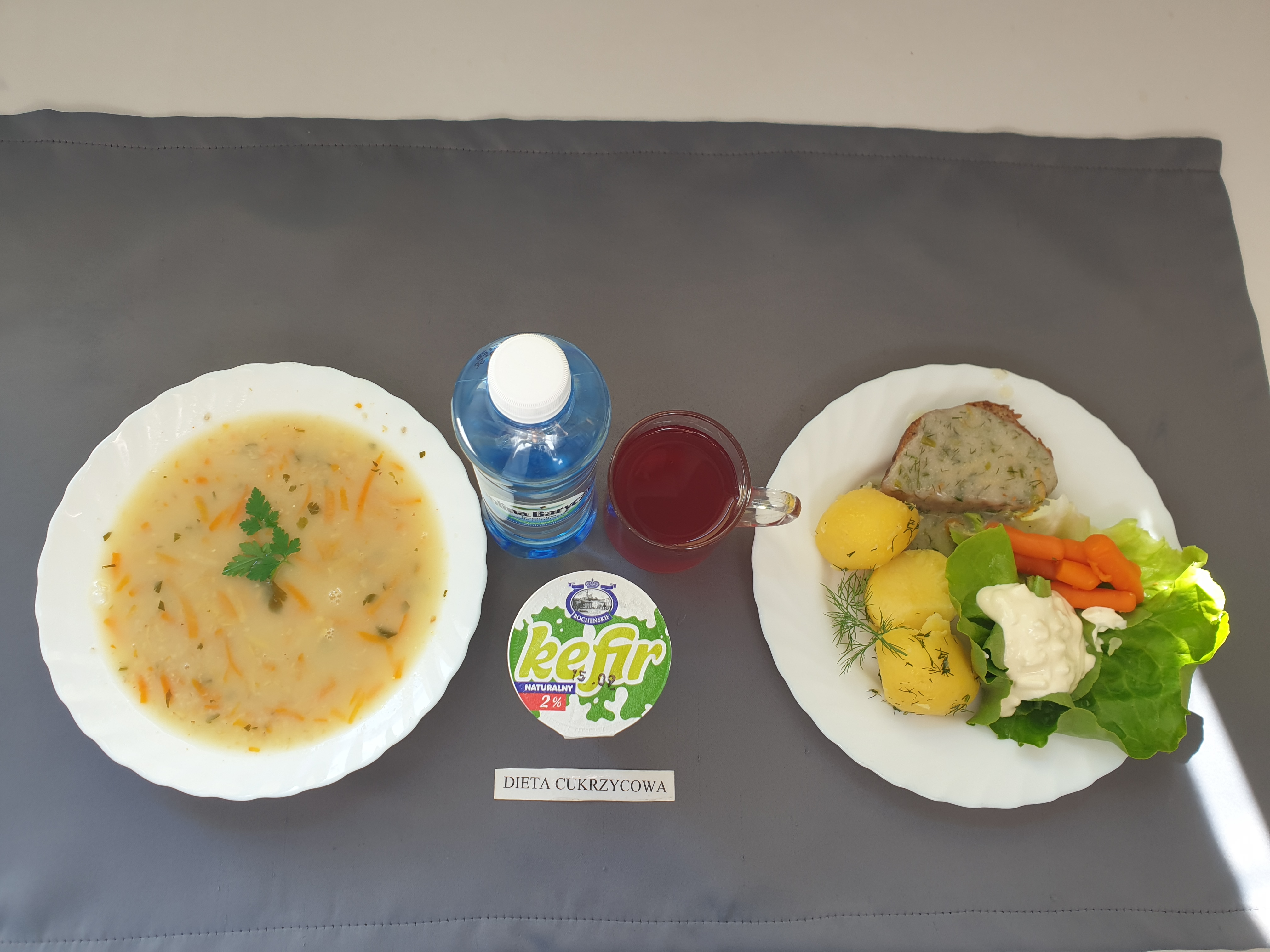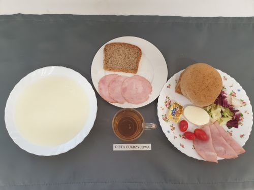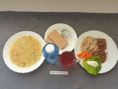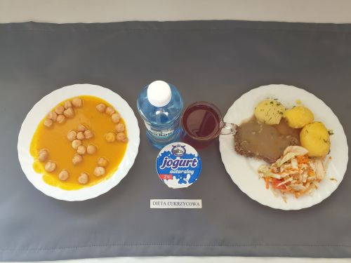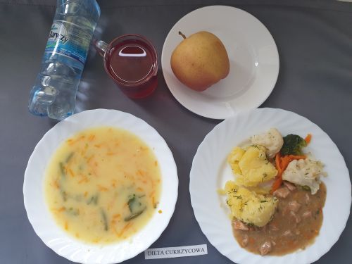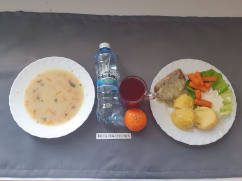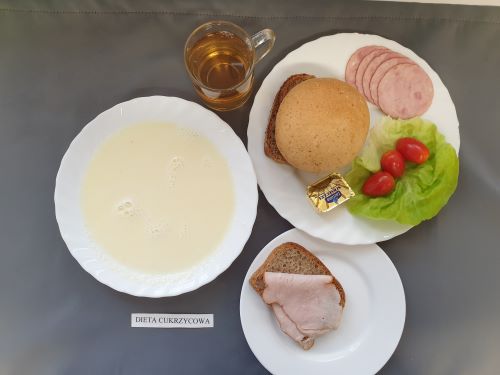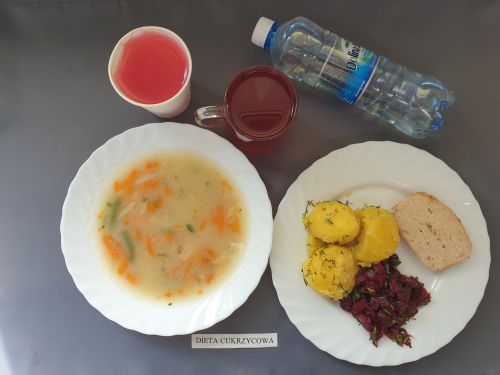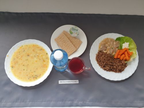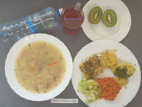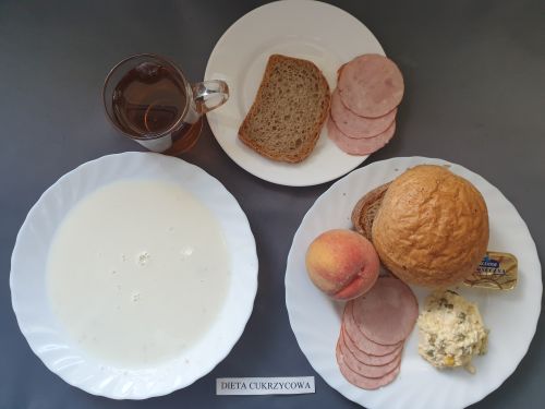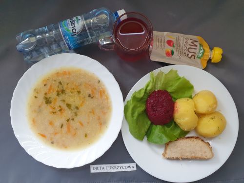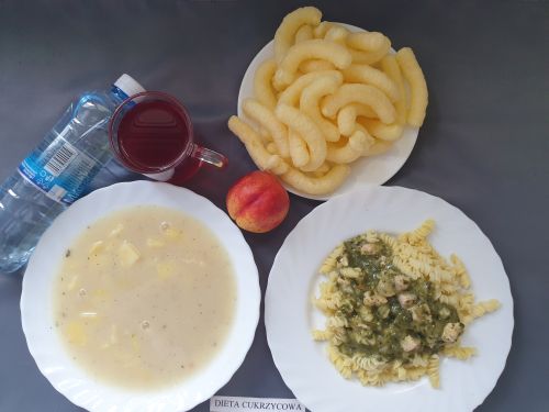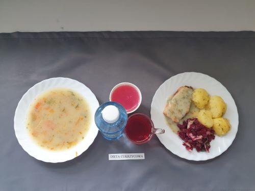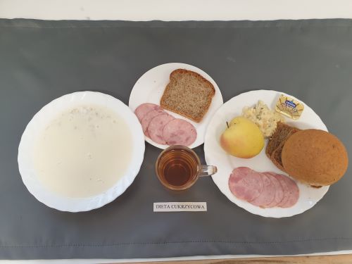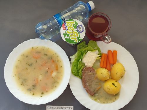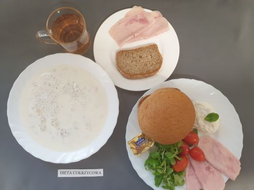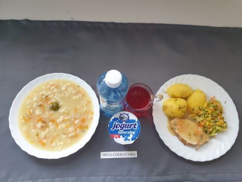 Dieta z ograniczeniem łatwo przyswajalnych węglowodanówŻurek z ziemniakami 350 ml (GLU, PSZ, GLU, OW, MLE) Podwieczorek: Kefir 200 ml (MLE)