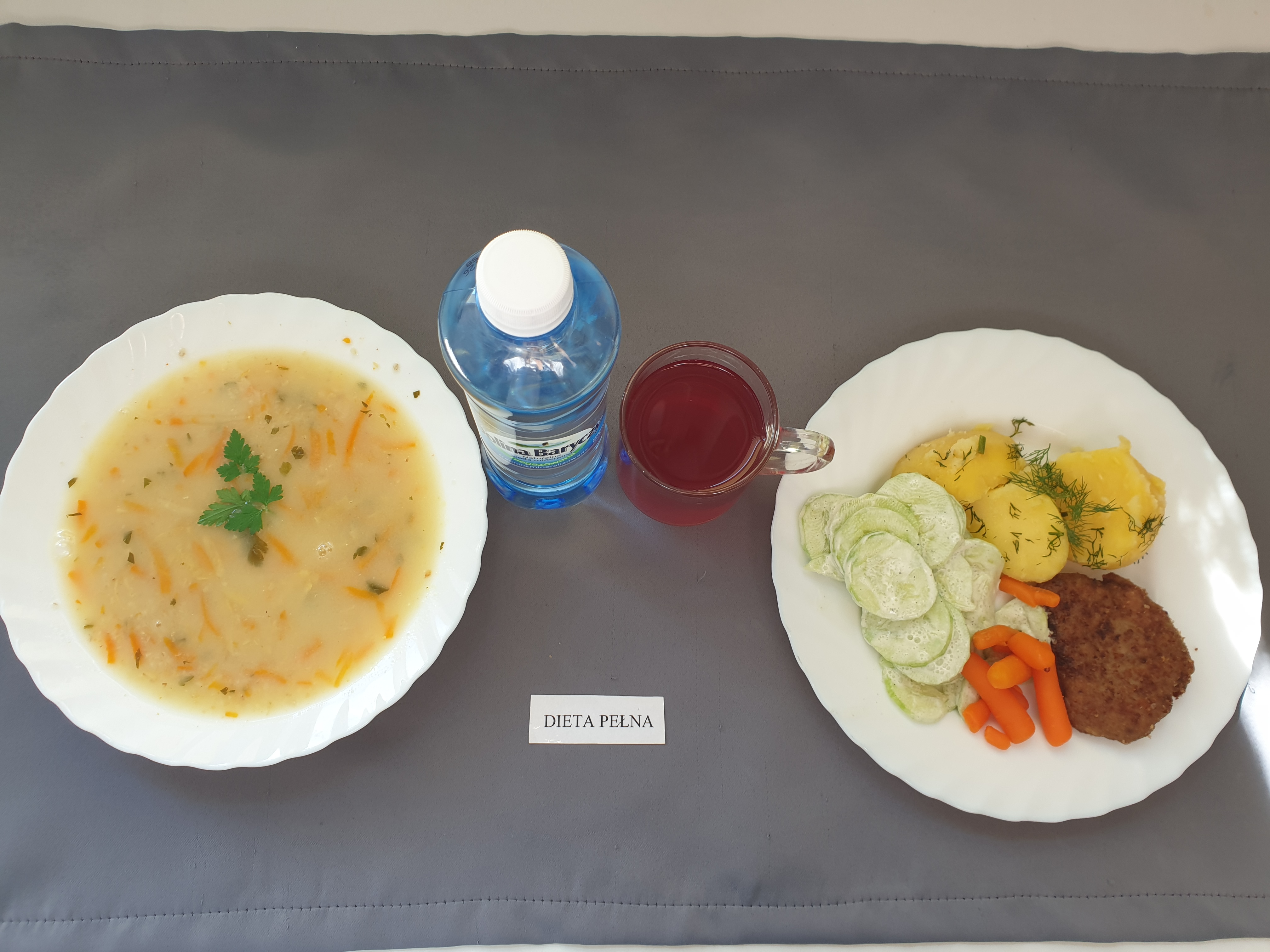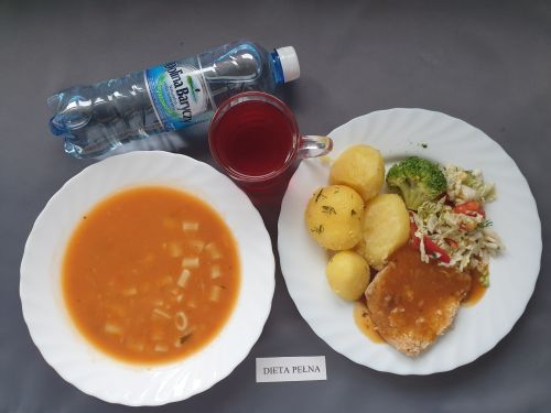 Dieta pełnaPomidorowa z makaronem 350 ml (GLU PSZ SEL MLE JAJ) bitka ze schabu 75g sos własny 100g (GLU PSZ) sałatka z kapusty pekińskiej 150g, (GOR ) brokuł 50g ziemniaki 180g (MLE) kompot z owoców mieszanych 250 ml woda mineralna 500 ml