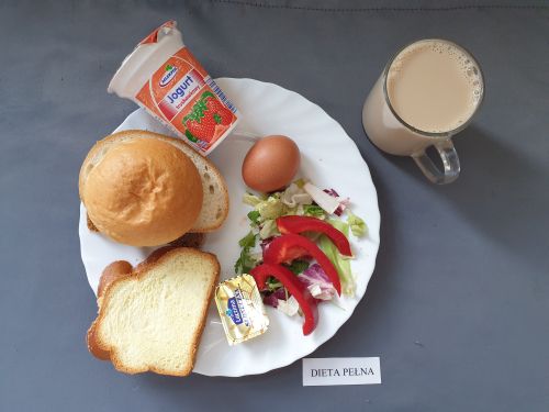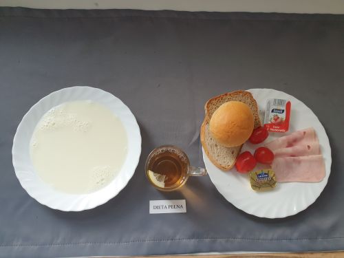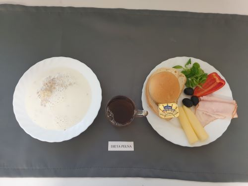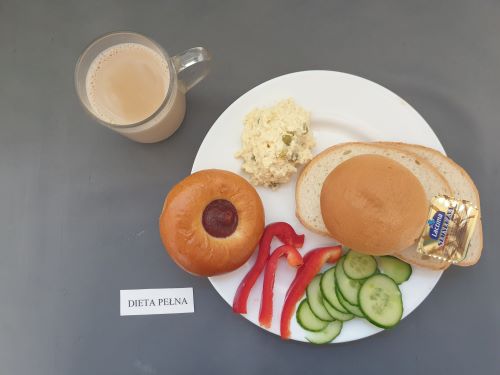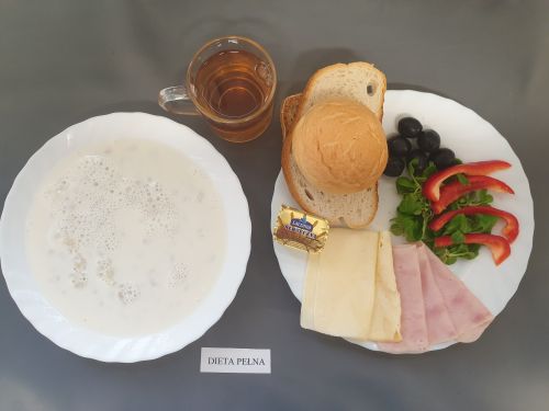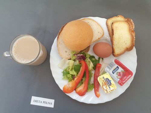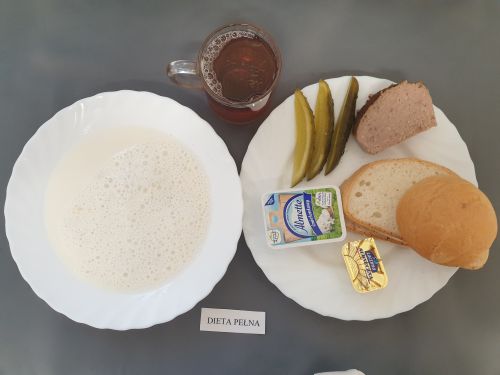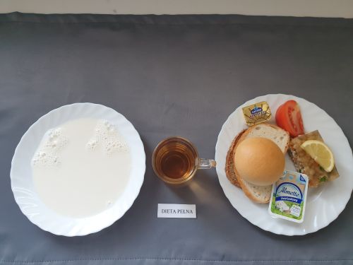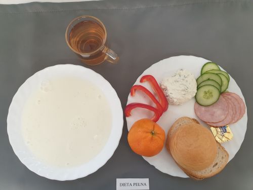 Dieta pełnaPłatki jęczmienne na mleku 300 ml (GLU JĘCZ GLU PSZ MLE) Pasztet drobiowy 50g, (MLE) może zawierać: (GLU PSZ, JAJ, MLE, SEL, GOR) ogórek kiszony 50g margaryna roślinna 15g pieczywo mieszane pszenno żytnie 50g (GLU PSZ GLU ŻYT) bułka hotelowa 30g (GLU PSZ) herbata z cytryną 250ml |