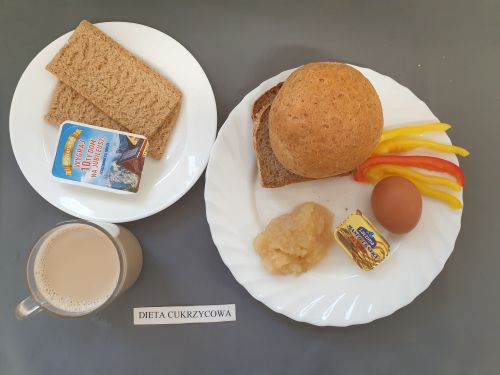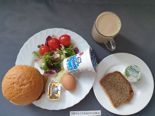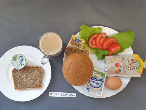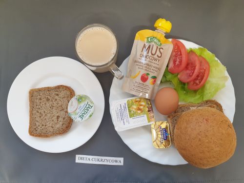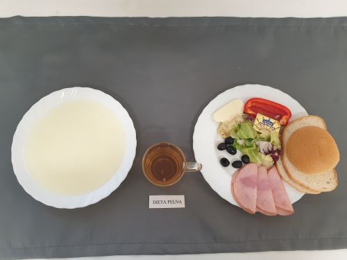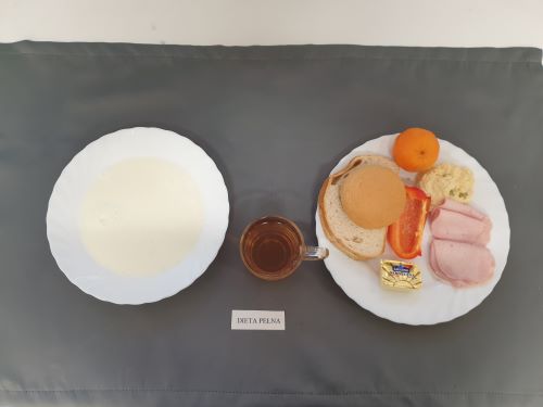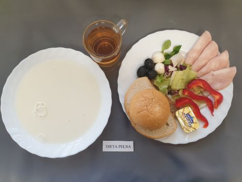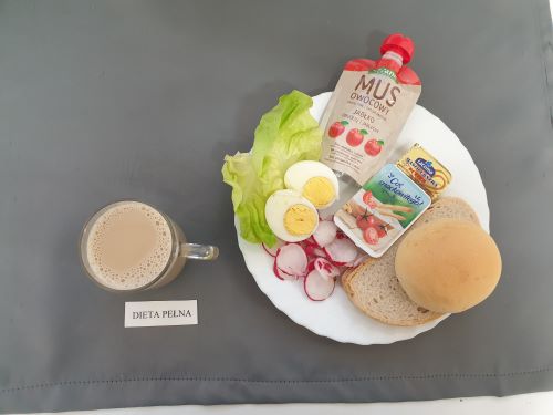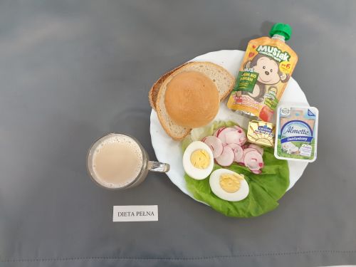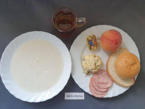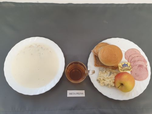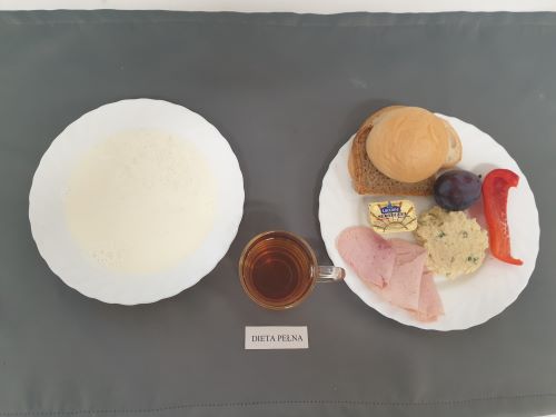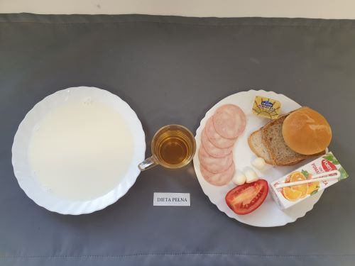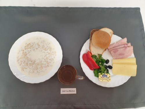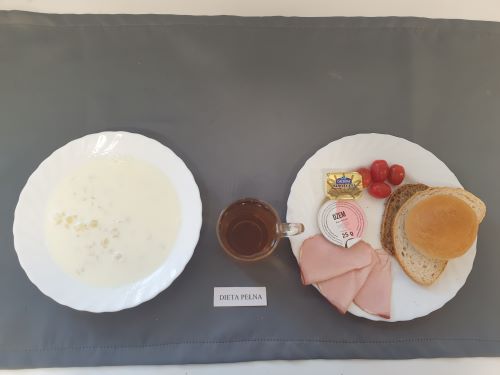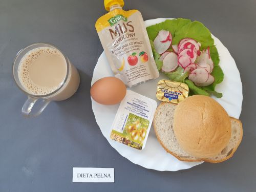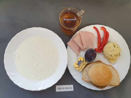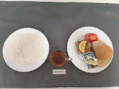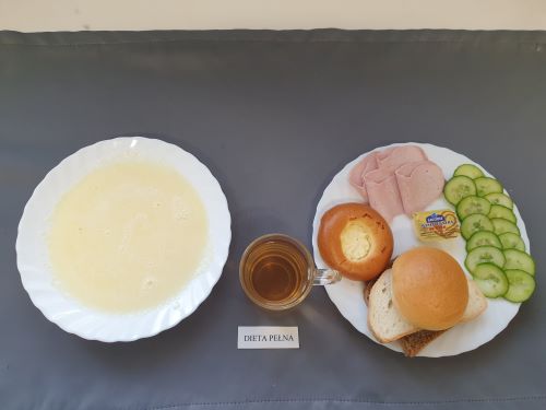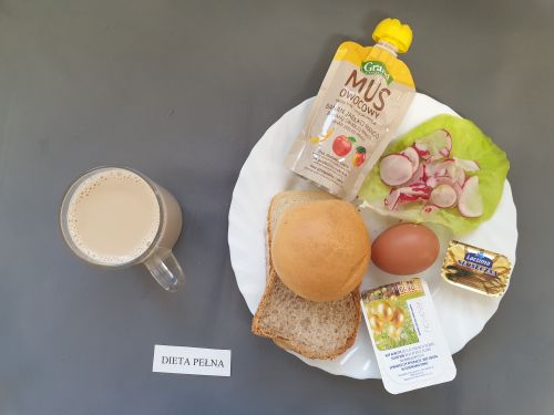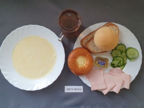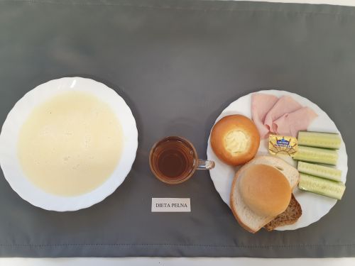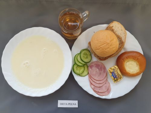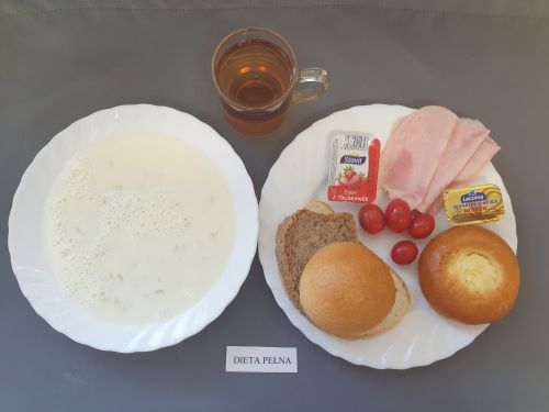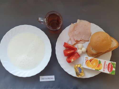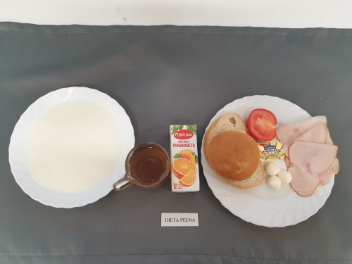 Dieta pełnaRyż na mleku 300 ml (MLE) szynka naturalna 40g (SOJ) pasta z jaj z ziel. 80g (MLE JAJ GOR) pomarańcza 250 g margaryna roślinna 15g bułka pszenna 30g (GLU PSZ) pieczywo mieszane pszenno żytnie 50g (GLU PSZ GLU ŻYT) herbata z cytryną 250 ml