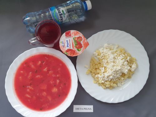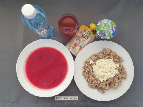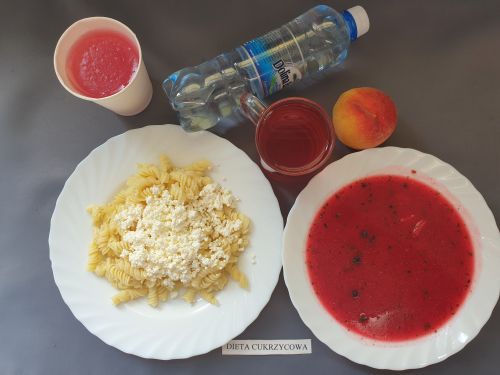 Dieta z ograniczeniem łatwo przyswajalnych węglowodanówBarszcz czerwony z ziemniakami, 350 ml(GLU PSZ SEL, MLE) makaron z serem 250g (MLE JAJ GLU PSZ) kompot b.c z owoców mieszanych 250 ml