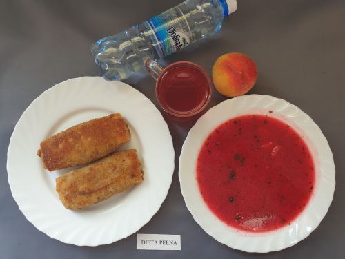 Dieta pełnaGrysikowa 350 ml (GLU PSZ SEL) kotlet pożarski 120g (JAJ GLU PSZ) sałatka z rukoli, fety i buraka 150g (MLE GOR) ziemniaki z koperkiem 180g (MLE) kompot z owoców mieszanych 250 ml Woda mineralna 500 ml