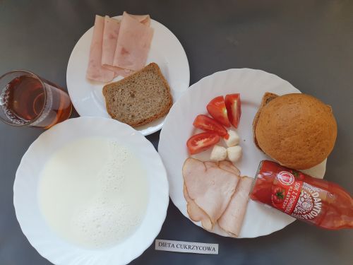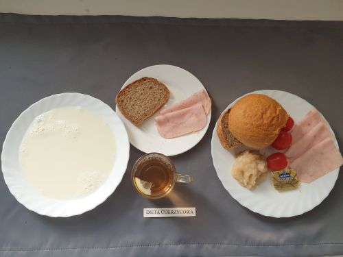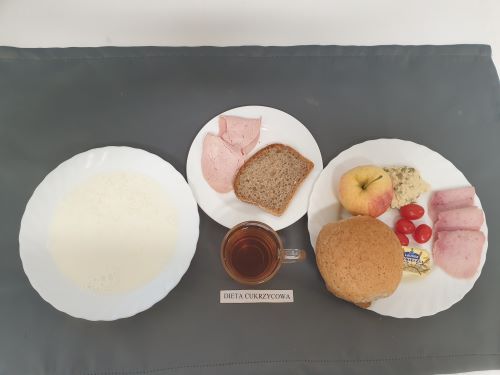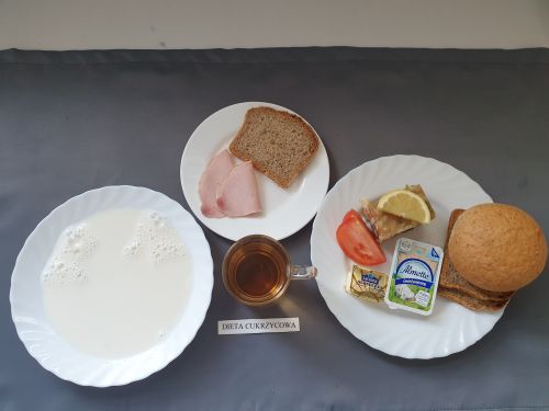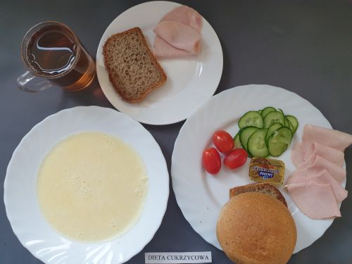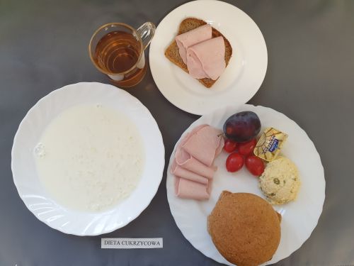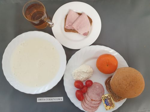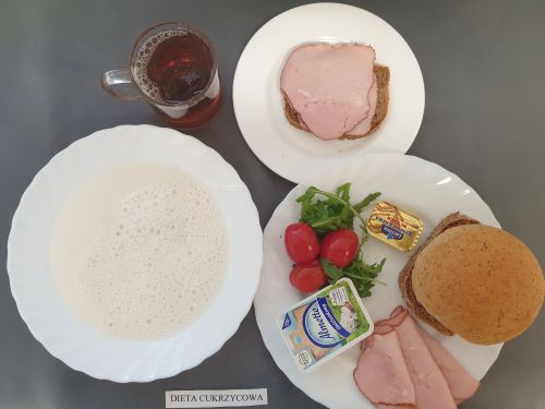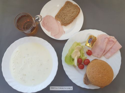 Dieta z ograniczeniem łatwo przyswajalnych węglowodanówKukurydzianka na mleku 300 ml (MLE) II śniadanie: Szynka 30g (SOJ) + Chleb graham 25g (GLU PSZ GLU ŻYT) |