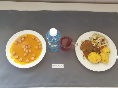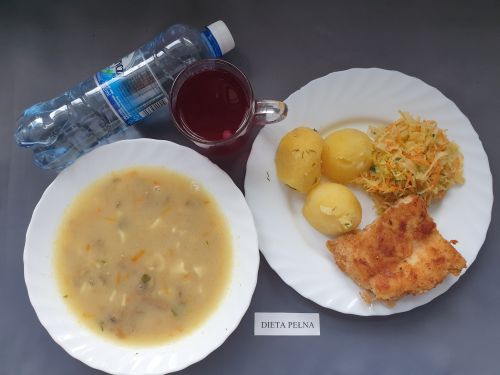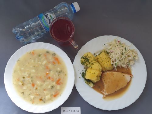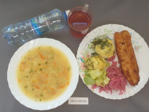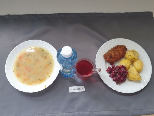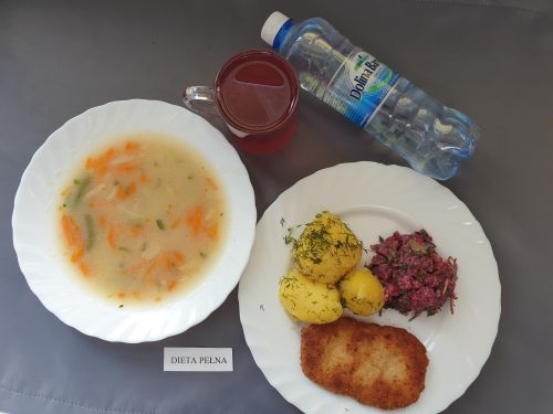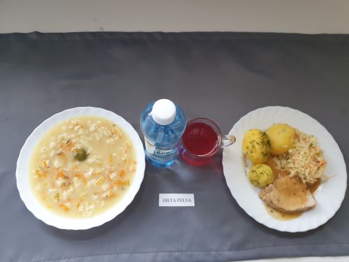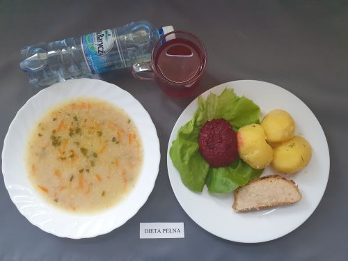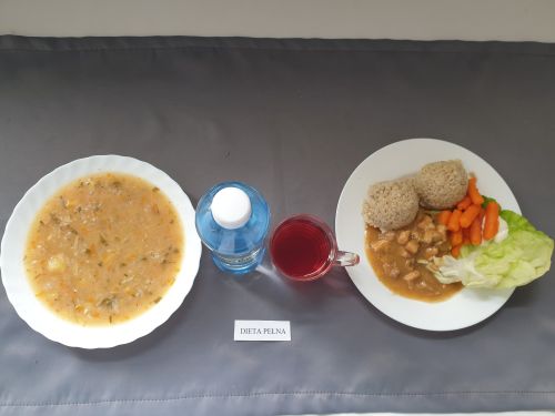 Dieta pełnaŻurek z ziemniakami 350 ml (GLU PSZ GLU OW MLE) filet z kurczaka w sosie warzywnym 200g ryż 150g (MLE) kompot z owoców mieszanych 250 ml woda mineralna 500 ml