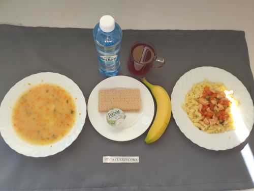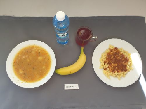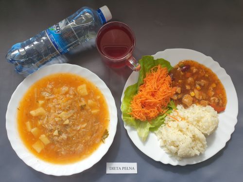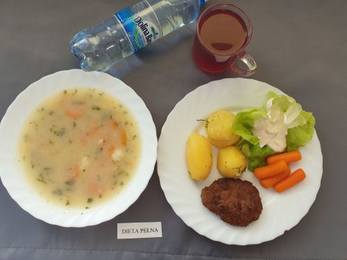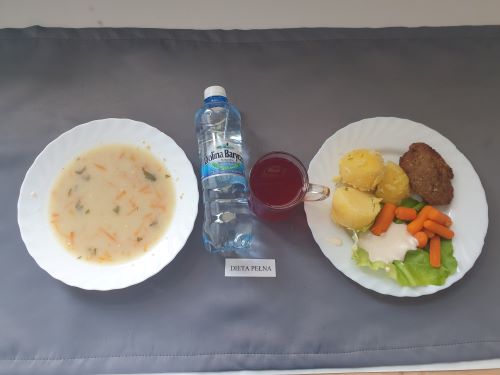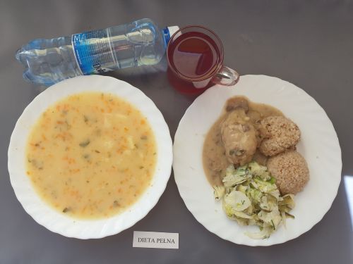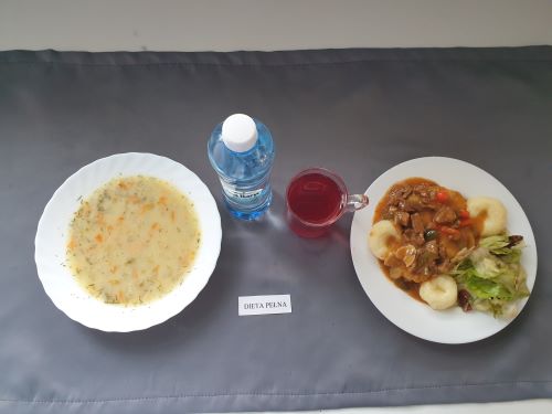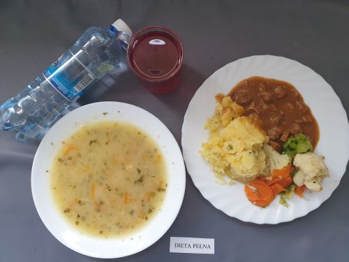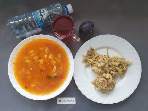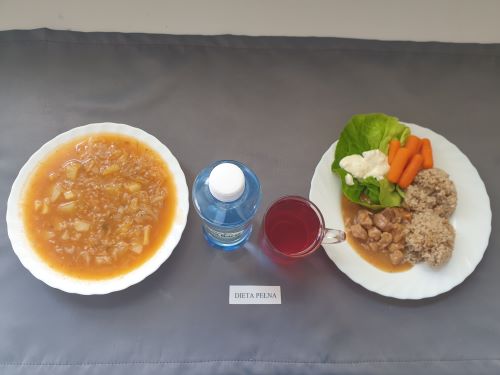 Dieta pełnaKapuśniak z ziemniakami, 350 ml (GLU PSZ SEL) gulasz z mięsa od szynki 130g (GLU PSZ) kasza na sypko 150g (MLE GLU PSZ) marchewka mini 50g kompot z owoców mieszanych 250 ml Woda mineralna 500 ml |