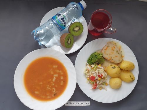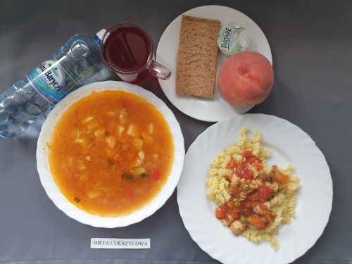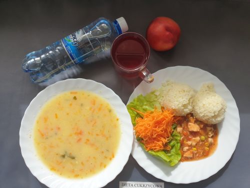 Dieta z ograniczeniem łatwo przyswajalnych węglowodanówŻurek z ziemniakami 350 ml (GLU PSZ GLU OW MLE) filet z kurczaka w sosie pomidorowo- warzywnym 200g ryż 150g (MLE ) kompot b.c. z owoców mieszanych 250 ml woda mineralna 500 ml II podwieczorek: Chrupki 15g |