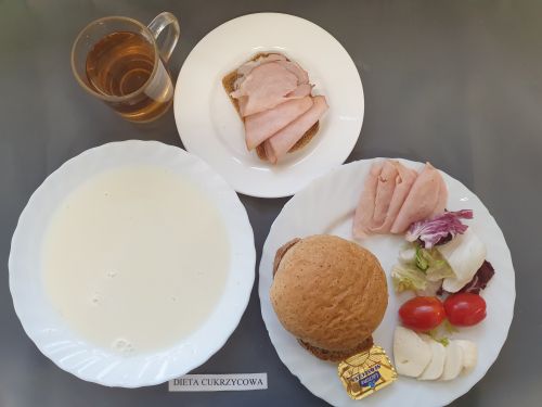 Dieta z ograniczeniem łatwo przyswajalnych węglowodanówZiemniaczana 350 ml(GLU PSZ SEL, ) Podwieczorek Bułka 30g,( GLU PSZ )masło10g(MLE), szynka naturalna 30g (SOJ) |