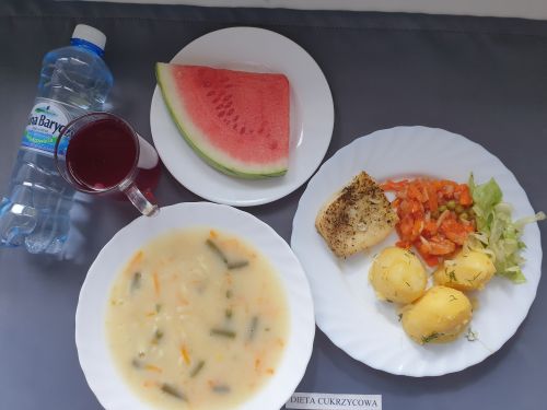 Dieta z ograniczeniem łatwo przyswajalnych węglowodanówZupa ziemniaczana 350 ml (GLU PSZ SEL) gulasz z mięsa od szynki dietetyczny 130g (GLU PSZ MLE SEL) kasza gryczana na sypko 150g (MLE ) marchewka mini 50g kompot b.c. z owoców mieszanych 250 ml Woda mineralna 500 ml Podwieczorek: Arbuz 200g |