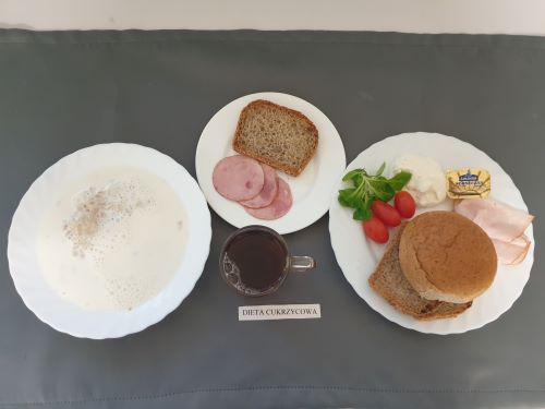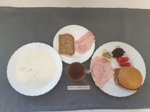 Dieta z ograniczeniem łatwo przyswajalnych węglowodanówRyż na mleku 300g (MLE) II śniadanie: Szynka 30g (SOJ) + Chleb graham 25g (GLU PSZ GLU ŻYT) |