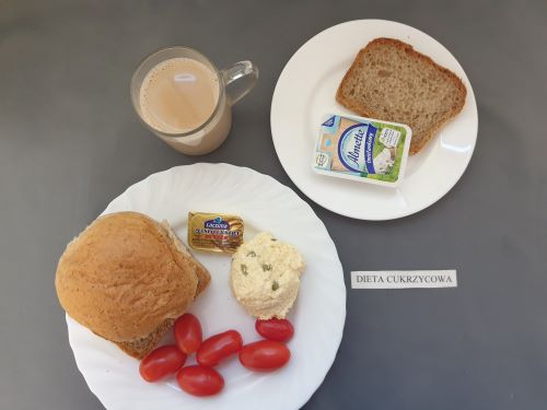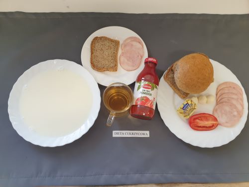 Dieta z ograniczeniem łatwo przyswajalnych węglowodanówMakaron na mleku 300 ml (GLU PSZ JAJ MLE) szynka konserwowa 40g (SOJ) pomidor koktajlowy50g margaryna roślinna 15g bułka graham50g (GLU PSZ GLU ŻYT) pieczywo graham50g (GLU PSZ GLU ŻYT) herbata b.c. z cytryną 250 ml |