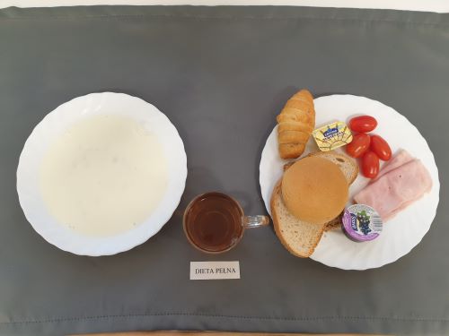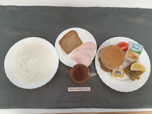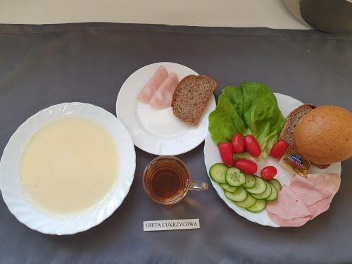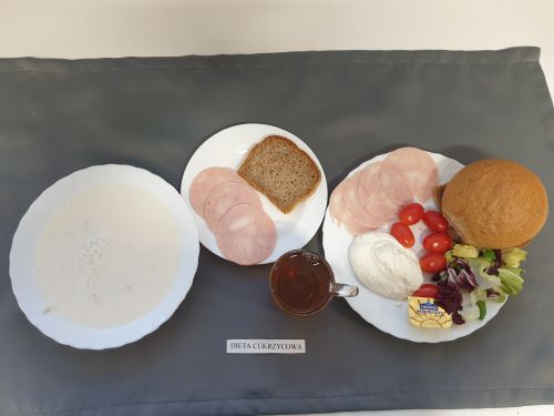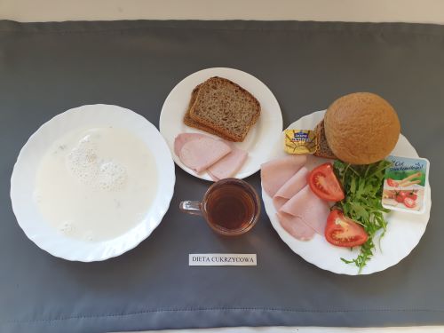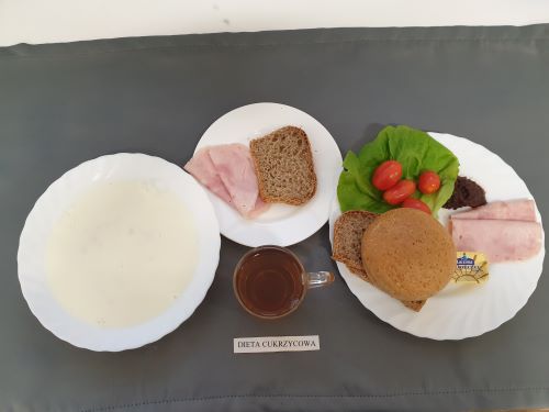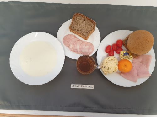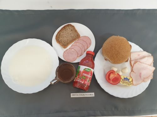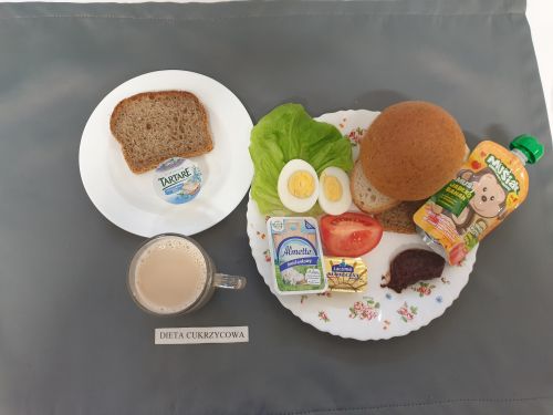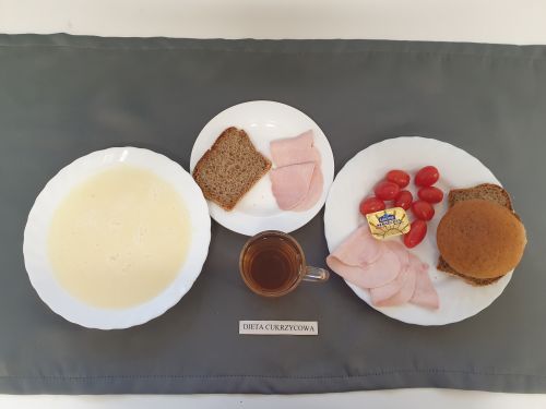 Dieta pełnaKukurydzianka na mleku 300 ml (MLE) | Dieta z ograniczeniem łatwo przyswajalnych węglowodanówKukurydzianka na mleku 300 ml (MLE) II śniadanie: Szynka 30g (SOJ) + Chleb graham 25g (GLU PSZ GLU ŻYT) | ||