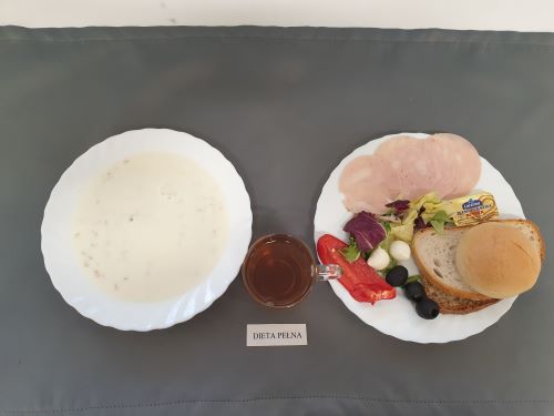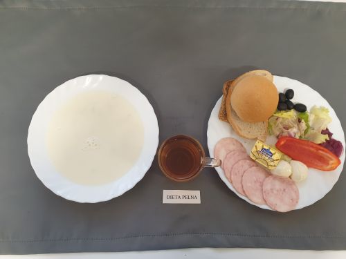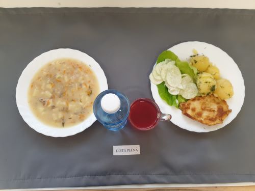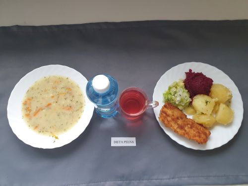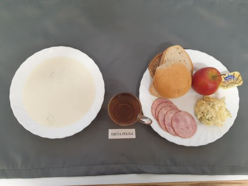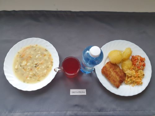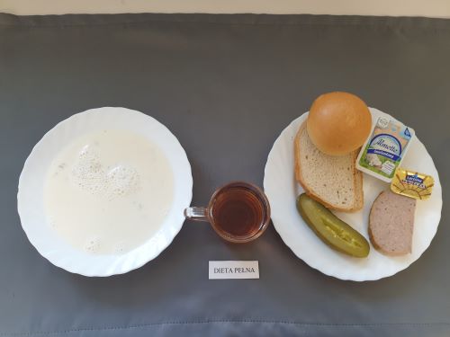 Dieta pełnaŻurek z ziemniakami 350 ml (GLU, PSZ, GLU, OW, MLE,) | Dieta z ograniczeniem łatwo przyswajalnych węglowodanówŻurek z ziemniakami 350 ml (GLU, PSZ, GLU, OW, MLE) Podwieczorek: Kefir 500 ml (MLE)