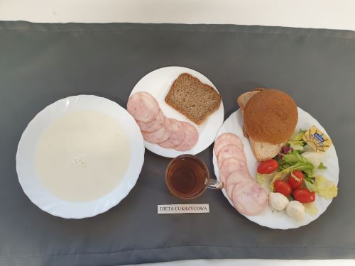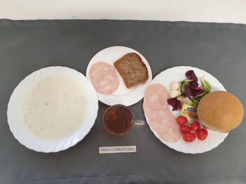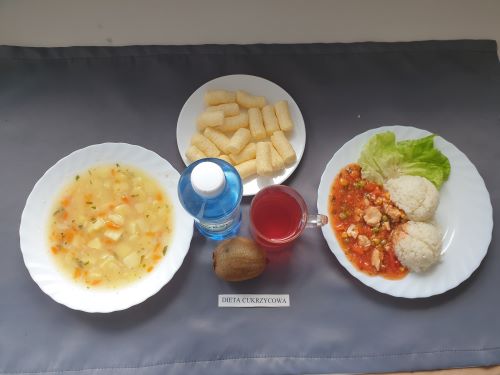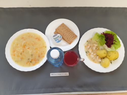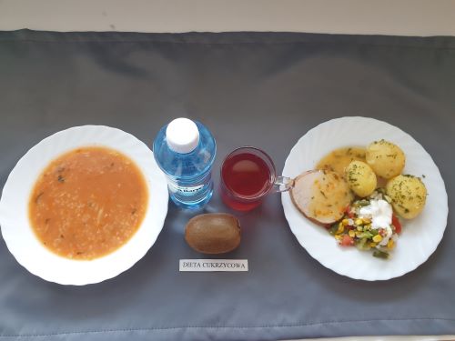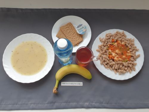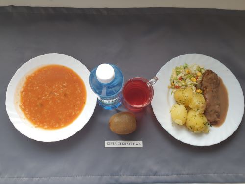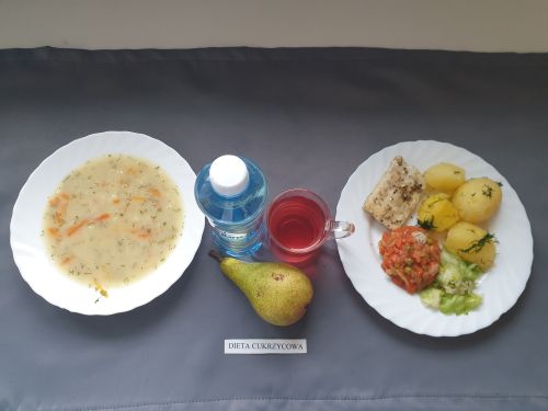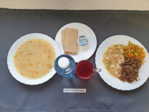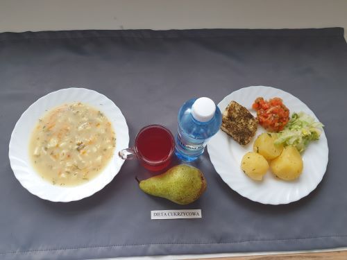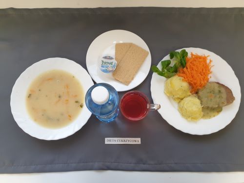 Dieta pełnaZupa ziemniaczana 350 ml (GLU PSZ SEL MLE) | Dieta z ograniczeniem łatwo przyswajalnych węglowodanówZupa ziemniaczana 350 ml (GLU PSZ SEL MLE) Podwieczorek: Brzoskwinia 150g | ||