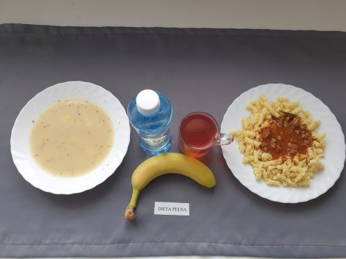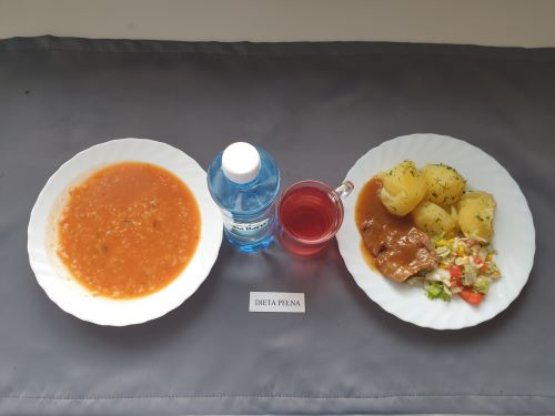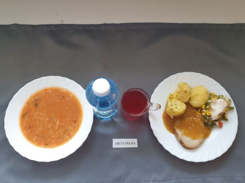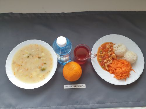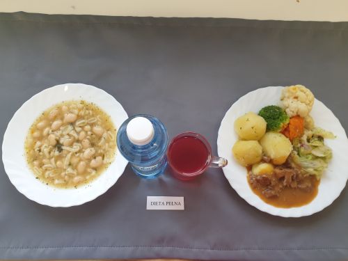Dieta pełnaBarszcz czerwony z ziemniakami, 350 ml (GLU, PSZ, SEL, MLE) | Dieta z ograniczeniem łatwo przyswajalnych węglowodanówBarszcz czerwony z ziemniakami, 350 ml (GLU PSZ SEL, MLE) Podwieczorek: Pomarańcza 250 g | ||