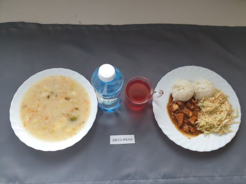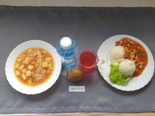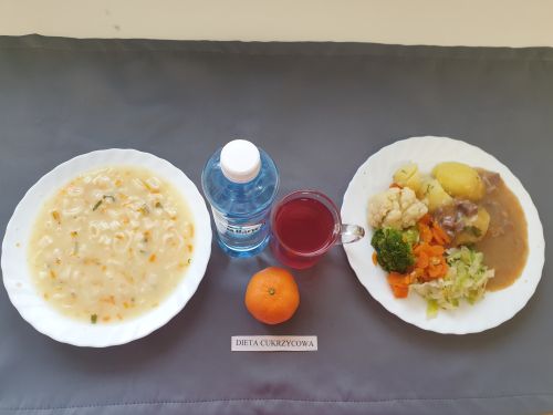 Dieta pełnaKapuśniak z ziemniakami, 350 ml (GLU PSZ SEL) gulasz z mięsa od szynki 130g (GLU PSZ) kasza na sypko 150g (MLE GLU PSZ) marchewka mini 50g kompot z owoców mieszanych 250 ml Woda mineralna 500 ml | Dieta z ograniczeniem łatwo przyswajalnych węglowodanówZupa ziemniaczana 350 ml (GLU PSZ SEL) gulasz z mięsa od szynki dietetyczny 130g (GLU PSZ MLE SEL) kasza gryczana na sypko 150g (MLE ) marchewka mini 50g kompot b.c. z owoców mieszanych 250 ml Woda mineralna 500 ml Podwieczorek: Arbuz 200g | ||