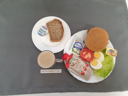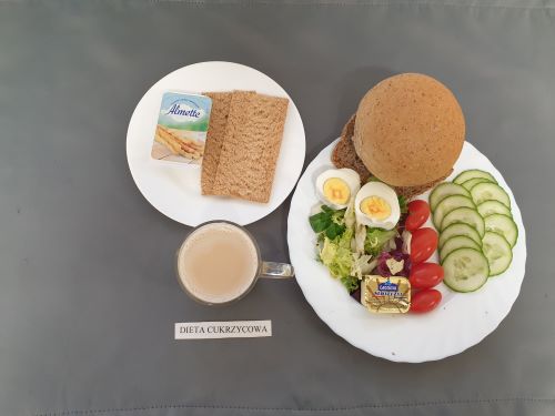 Dieta pełnaJajko gotowane 1 szt klasa L (JAJ) | Dieta z ograniczeniem łatwo przyswajalnych węglowodanówJajko gotowane 1 szt klasa L (JAJ) II śniadanie: Serek śmietankowy 20g (MLE) + Chleb graham 25g (GLU PSZ GLU ŻYT) | ||