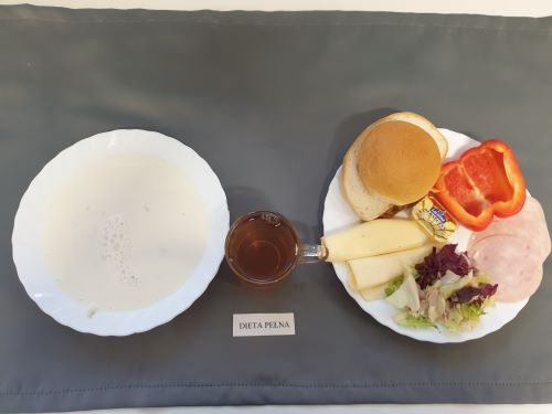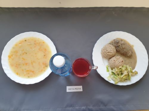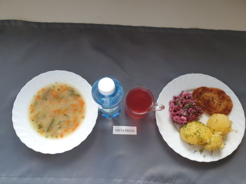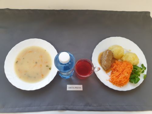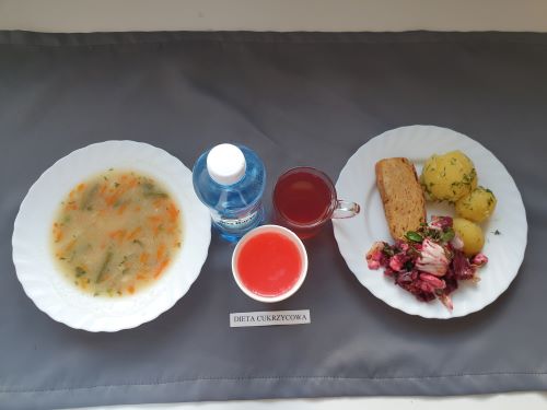 Dieta pełnaBarszcz czerwony z ziemniakami, 350 ml(GLU PSZ SEL, MLE) | Dieta z ograniczeniem łatwo przyswajalnych węglowodanówBarszcz czerwony z ziemniakami, 350 ml(GLU PSZ SEL, MLE) Podwieczorek: Bułka 30g, (GLU PSZ) masło10g (MLE), szynka naturalna 30g (SOJ) | ||