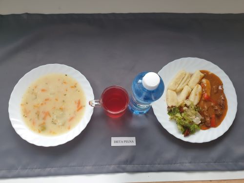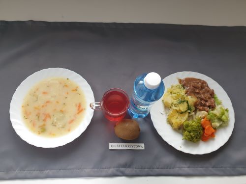 Dieta pełnaZupa węgierska z ziemniakami 350 ml (SEL) | Dieta z ograniczeniem łatwo przyswajalnych węglowodanówZupa jarzynowa z kurczaka z ziemniakami 350 ml (SEL) Podwieczorek: Serek śmietankowy 20g (MLE) + Chleb waza 20g (GLU ŻYT GLU PSZ MLE) | ||