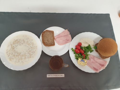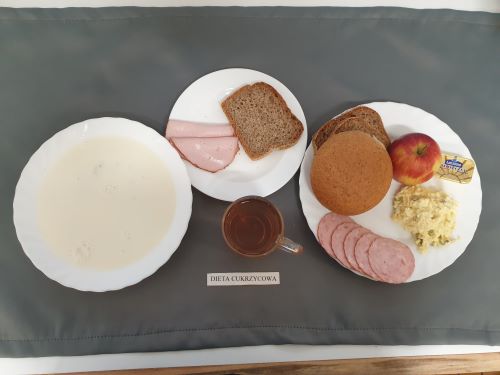 Dieta pełnaOwsianka na mleku 300g(GLU PSZ GLU OWS MLE) kiełbasa krakowska sucha 40g (SOJ) sałatka z jaj, groszku, ogórka, cebuli 80g (JAJ MLE GOR) margaryna roślinna 80% 15g jabłko 200g bułka pszenna 30g (GLU PSZ) pieczywo mieszane pszenno żytnie 50g (GLU PSZ GLU ŻYT) herbata z cytryną 250 ml | Dieta z ograniczeniem łatwo przyswajalnych węglowodanówOwsianka na mleku 300g(GLU PSZ GLU OWS MLE) kiełbasa krakowska sucha 40g (SOJ) sałatka z jaj, groszku, dietetyczna 80g (JAJ MLE GOR) margaryna roślinna 80% 15g bułka graham 50g (GLU PSZ GLU ŻYT) pieczywo graham 50g (GLU PSZ GLU ŻYT) herbata b.c. z cytryną 250 ml II śniadanie : Szynka 30g (SOJ) + Chleb graham 25g (GLU PSZ GLU ŻYT) | ||