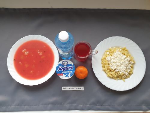 Dieta pełnaPomidorowa z makaronem350 ml(GLU PSZ JAJ ,SEL, MLE) | Dieta z ograniczeniem łatwo przyswajalnych węglowodanówPomidorowa z makaronem350 ml(GLU PSZ JAJ ,SEL, MLE) Podwieczorek: Bułka 30g (GLU PSZ), masło10g (MLE), | ||