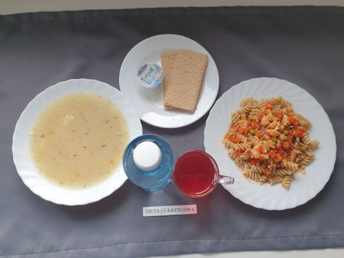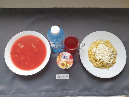 Dieta pełnaBarszcz czerwony z ziemniakami, 350 ml(GLU PSZ SEL, MLE) makaron z serem 250 (MLE JAJ GLU PSZ) kompot z owoców mieszanych 250 ml | Dieta z ograniczeniem łatwo przyswajalnych węglowodanówBarszcz czerwony z ziemniakami, 350 ml(GLU PSZ SEL, MLE) makaron z serem 250g (MLE JAJ GLU PSZ) kompot b.c z owoców mieszanych 250 ml