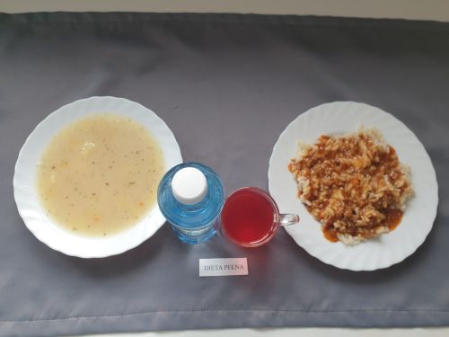 Dieta pełnaOgórkowa z ryżem350 ml (GLU, PSZ, SEL, MLE) | Dieta z ograniczeniem łatwo przyswajalnych węglowodanówZupa ryżowa 350 ml (GLU, PSZ, SEL, MLE) Podwieczorek: Sok pomidorowy 330ml | ||